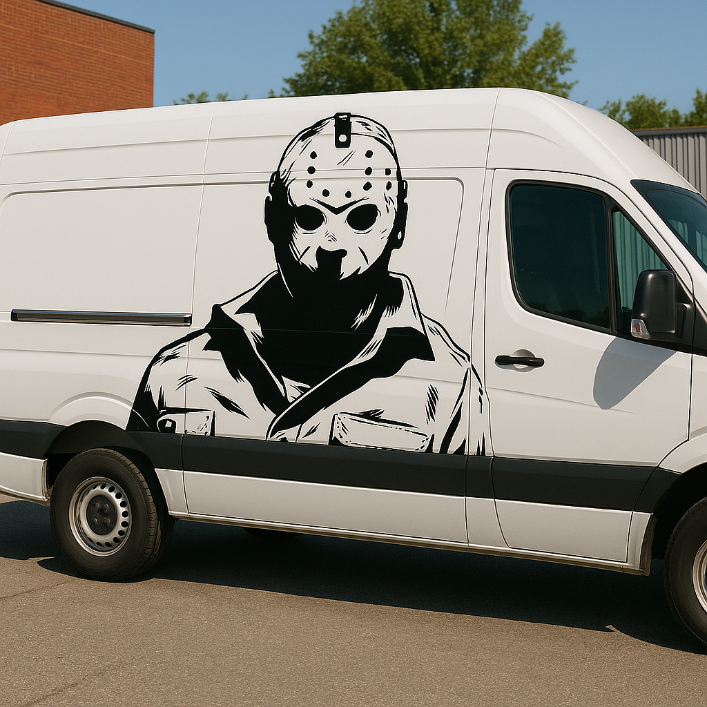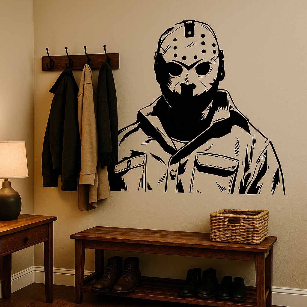This Jason Voorhees inspired vinyl wall decal features the unmistakable hockey mask and upper body silhouette in a bold, graphic composition. The sharp contrast and detailed linework create a powerful slasher statement — instantly recognisable and unapologetically cinematic.
