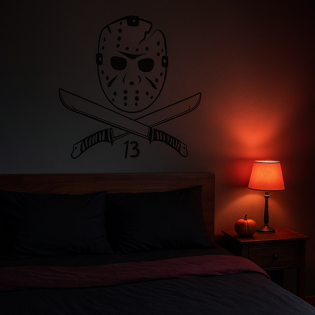 This Jason Voorhees inspired vinyl wall decal features the unmistakable hockey mask paired with crossed machetes and the number 13 beneath — a bold tribute to classic slasher cinema. The clean line-art silhouette keeps the design sharp and modern while remaining instantly recognisable to horror fans.