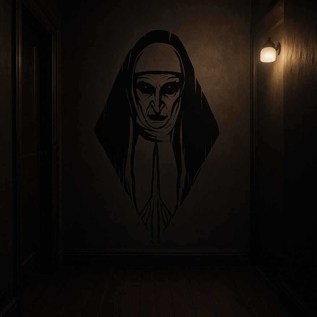 This Valak inspired vinyl wall decal presents the demonic nun in a stark, commanding silhouette. The elongated shadows, hollowed gaze and sharp contours create a chilling focal point that radiates gothic intensity without overwhelming the space.
