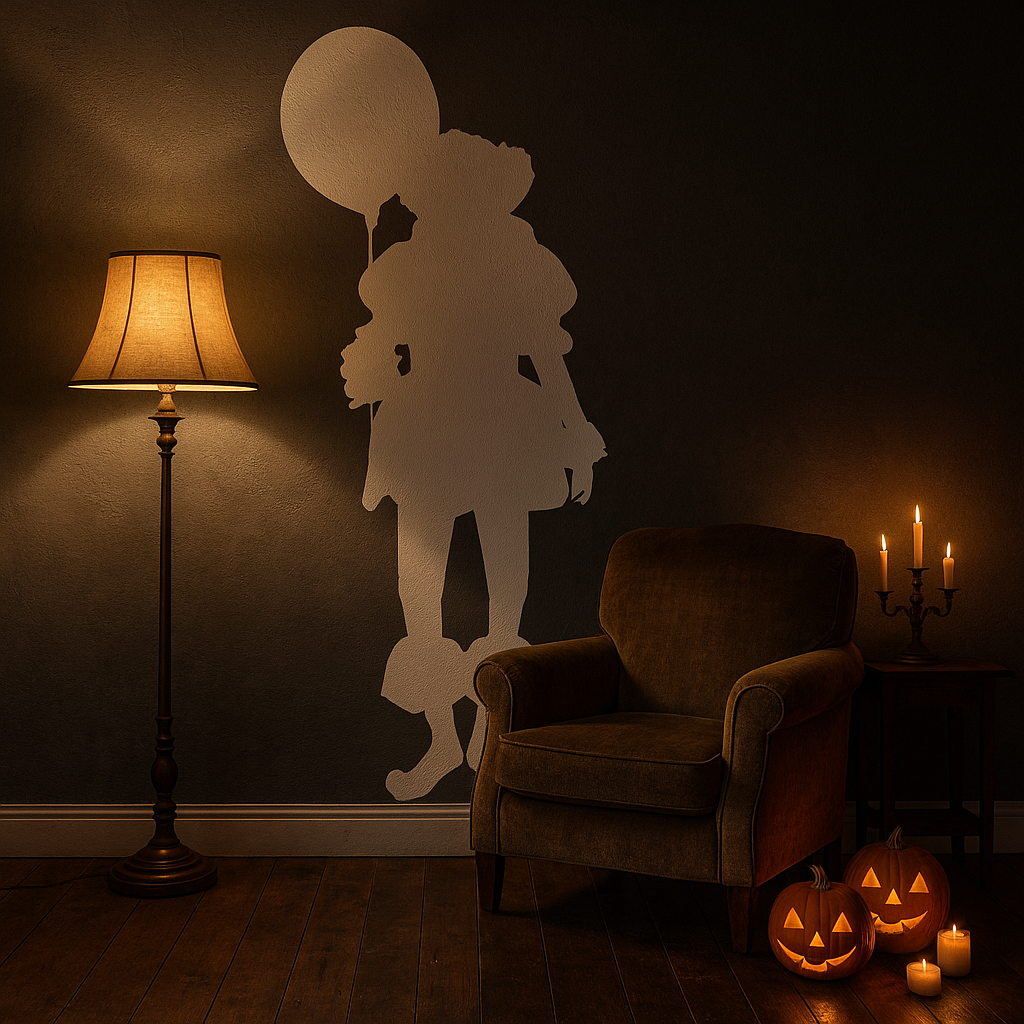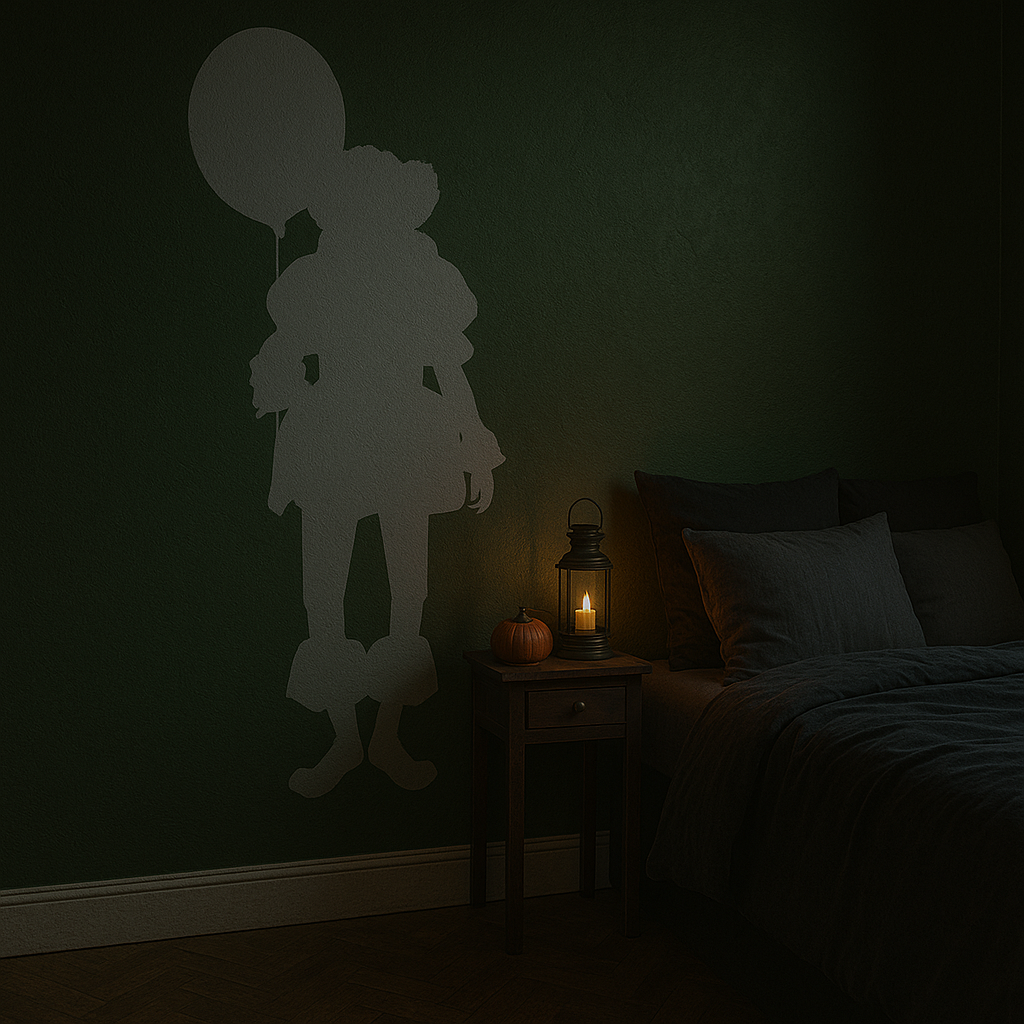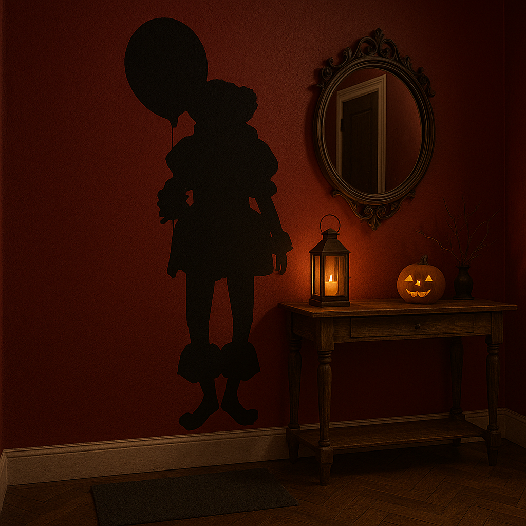 This Pennywise inspired vinyl wall decal features a haunting silhouette design — the iconic childlike figure holding a balloon, reduced to a stark, shadowed form. The minimalist composition creates a psychological horror effect, subtle in detail yet instantly recognisable.