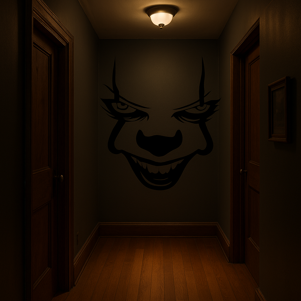 A bold, minimalist horror wall decal featuring a sinister clown face silhouette inspired by classic horror cinema. Designed with sharp, aggressive linework and exaggerated expression for maximum impact.